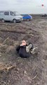 Boy ties a stone with rope and spins it until it hits his foot