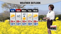 In the afternoon, it'll feel similar to today,... Seoul topping out at 25 degrees, Gyeongju 30 degrees, and Busan 20 degrees.