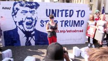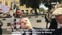 Reprenant une tradition du carnaval niçois, des militants La France Insoumise organisent vendredi 4 mai un "paillassou", un jeu consistant à faire sauter un pantin dans un drap tenu à plusieurs, pantin à l'effigie d'Emmanuel Macron, en prélude à la "fête à Macron" organisée le lendemain à Paris à l'appel du député LFI François Ruffin. Durée: 00:25