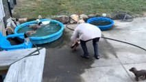 Girl tosses duck into swimming pool for a fun-filled game of joy
