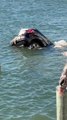 A group of people can be seen lifting up the SUV while a police officer and a passerby pull the man out.