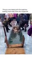 While crossing the road the dude slipped a bit in front of the standing car because of ice on the road. And luckily it saved him from getting hit.