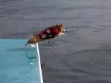 Un chien fait son 1er saut dans l'eau