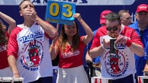 오늘 뉴욕 코니아일랜드에서 열린 '7월 4일 핫도그 먹기 대회'에서 지난해 챔피언인 34살 조이 체스넛 씨는 당시 기록보다 2개가 더 많은 74개를 먹었습니다.