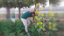 Bursa'nın İnegöl ilçesinde İnegöl Alası adıyla tescilli ay çekirdeğinin hasadı sırasında bir ayçiçeğinin siyah-beyaz görüntüsü görenleri şaşırttı.