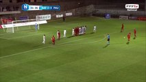 Coup franc bien tiré mais la reprise de la tête passe au dessus des buts.