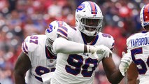 Cincinnati Bengals linebacker Carl Lawson refuses to be stopped as he powers his way through the offensive line and sacks Buffalo Bills quarterback Josh Allen.