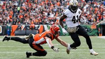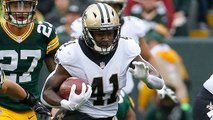 New Orleans Saints running back Alvin Kamara receives the handoff and pushed through Buccaneers defense for an easy touchdown.