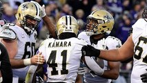 New Orleans Saints running back Alvin Kamara receives the hand off and runs the ball in for a touchdown.