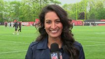 Pittsburgh Steelers running back James Conner fumbles the ball as Cleveland Browns defensive lineman Myles Garrett slaps it out of his hands and defensive back Jabrill Peppers rushes it to the 1-yard line.