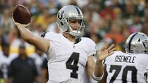 Oakland Raiders quarterback Derek Carr throws to wide open wide receiver Amari Cooper in the middle of the field for a 30-yard completion.