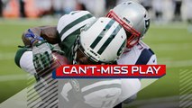New England Patriots cornerback Jonathan Jones leaps into the air and grabs the football with one hand for an interception.