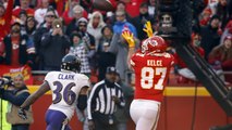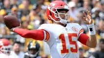 Kansas City Chiefs quarterback Patrick Mahomes throws a strong pass over the middle to tight end Travis Kelce for an 11-yard TD.