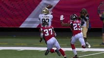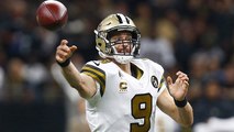 New Orleans Saints quarterback Drew Brees escapes from the Los Angeles Rams defense and dives for a first down.