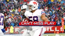 Detroit Lions cornerback Tracy Walker leaps into the air with two other players and rips the ball out of Carolina Panthers wide receiver Curtis Samuel's hands for his first career interception.