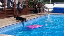 Ce chien a une façon marrante de traverser une piscine ...