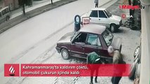 Kahramanmaraş'ta kaldırım çöktü! Otomobil çukurun içinde kaldı