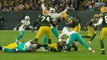 Atlanta Falcons linebacker De'Vondre Campbell sacks Green Bay Packers quarterback Aaron Rodgers for a loss of 9 yards.