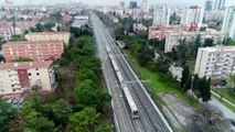Halkalı-Sirkeci arasında devam eden banliyö tren hattındaki yolcuları taşıyacak Marmaray treni test sırasında ilk kez havadan görüntülendi.