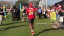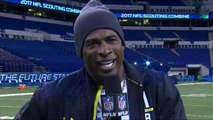 New York Jets safety Jamal Adams delivers a pitch to Pittsburgh Steelers wide receiver Antonio Brown and running back Le'Veon Bell and talks about hitting the Patriots mascot during Pro Bowl practice.