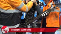 İZMİR Büyükşehir Belediyesi'nin makine teknikerleri, hurdaya ayrılan motosiklet, otobüs, kamyon ve vinç parçalarını sanat eserine dönüştürmeye devam ediyor. Usta ellerden çıkan son eser ise 'Gitar Çalan Rockçı' oldu.