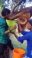 Honey bees- crazy guys taking wild honeycomb from the bees without protection. They are going to be in pain later!