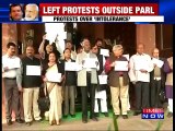 Several members of parliament from the Left staged a protest outside the Parliament House here on Tuesday, taking up the issue of