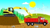 Yellow Construction Machines and Construction of a backyard pool - excavator, concrete mixer and truck. Tales for children