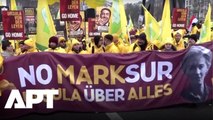 Pro-EU and anti-EU protesters congregate outside the UK parliament with flags, banners and placards Tuesday shortly before PM Theresa May's Brexit vote is defeated.