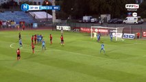 Coup franc bien frappé au second poteau mais personne à la réception.
