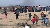 Sınırın diğer tarafındaki İsrail güçlerinin gösteriye müdahalesi üzerine yaralanan bir Filistinli, sağlık ekipleri tarafından bölgeden uzaklaştırıldı.