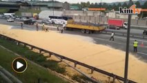 Ketua Polis Daerah Petaling Jaya ACP Mohd Zani Che Din hari ini berkata kejadian itu berlaku pukul 10 pagi apabila lori terbabit dipercayai terbabas lalu terbalik menyebabkan beras serta bihun berselerak di lebuh raya itu.