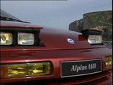 Présentation commentée et en musique des détails intérieurs et extérieurs du véhicule, puis vues d'Alpine A610 Turbo roulant sur des routes de campagne dans la région d'Etretat.