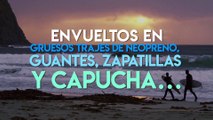 Los surfistas están envueltos en gruesos trajes de neopreno.