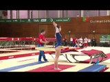 UEG Official - 2014 European Championships in Guimaraes (POR). Double Mini Trampoline, Men's junior Final. Tiago Romao (POR) -- Pass 1 : 34.900 (Execution : 27.300, Difficulty : 7.60). Pass 2 : 35.600 (Execution : 28.800, Difficulty : 6.80). Total : 70.500. New Junior European Champion.