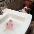 Quand une chienne tient la serviette d'un hérisson pour qu'il prenne un bain. Trop cute !