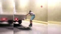 Yaklaşık 100 kilometre hızla ilerleyen kamyonetin arkasına tutunarak ölüme meydan okudu
