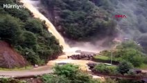 ( RİZE )- Rize’nin Çayeli ilçesinde bulunan Ağaran Şelalesi, bölgede kısa süreli yağan şiddetli yağmurun ardından taştı RİZE