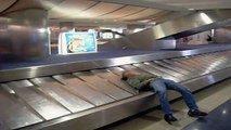 Sleeping Man Takes a Ride on Baggage Claim