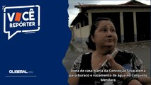 Dona de casa Maria da Conceição Silva alerta para buraco e vazamento de água no Conjunto Mendara