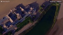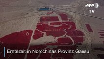 Eine riesige Menge rote Chilischoten sind in der nordwestchinesischen Provinz Gansu zur Erntezeit aufgeschüttet worden - kurz vor dem 70. Jahrestag der Gründung der Volksrepublik haben Bauern eine Landkarte Chinas nachgebildet sowie eine riesige Flagge.