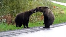 İki boz ayı yol ortasında birbirine girdi