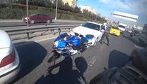 Malatya'da akaryakıt istasyonundan atık toplayan gencin çalışır durumda bıraktığı motosikleti, kendiliğinden hareket ederek, park halindeki otomobile çarptı. Durdurulamayan motosiklet tekrar aynı araca çarptı. Bir vatandaş hafif yaralandı. (İHA)