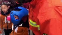 Firefighters from southern China's Beihai freed a nine-year-old boy's head from a stone guardian lion on Monday (October 14).