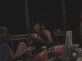 A guy and girl are shotgunning beers in a kitchen in Orlando, Florida when the guy pranks the girl by blowing the beer all over her face on October 6.