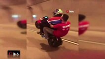 Sarıyer’in çeşitli noktalarında bir maganda motosikletine sırtüstü uzanıp ayaklarını da gidona uzattıktan sonra metrelerce tek tekerlek üzerinde gitti.