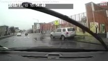 Police are holding guns trying to stop the driver from fleeing but are continuously ignored. The driver almost runs over one of the policemen.