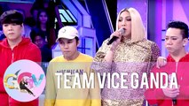 Together with an audience member, Dimples Romana, Brenda Mage, and Petite take turns in stacking chairs before promoting their 2019 MMFF entry, "M&M: The Mall, The Merrier."