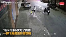 Il donne un grand coup de pied à un autre scooter et le fait lourdement chuter