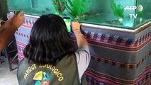 Un grupo de 36 ranas gigantes del lago Titicaca, una especie en peligro de extinción muy codiciada por sus supuestas propiedades afrodisíacas, fue presentada a periodistas tras nacer en cautiverio en un zoológico de Lima, Perú.